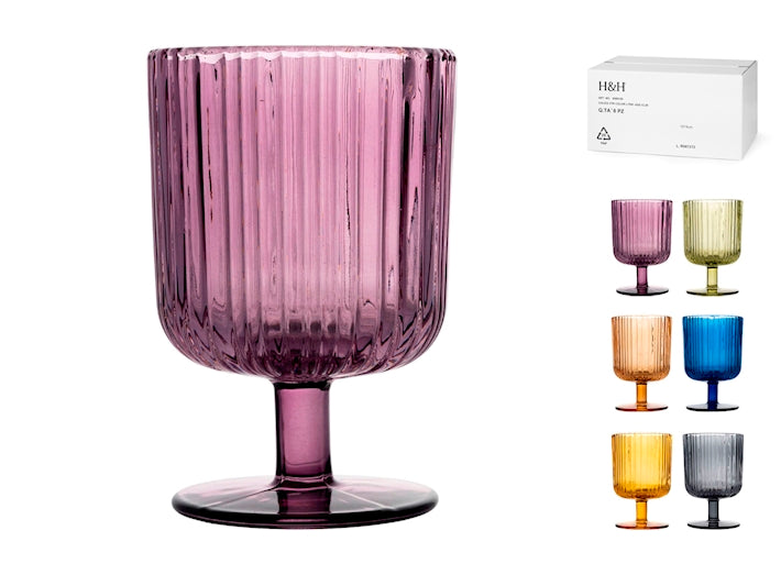 Elegante set da 6 calici Lyric da 26 cl dai colori assortiti. Realizzati in vetro di qualità, garantiscono trasparenza e resistenza all'uso quotidiano