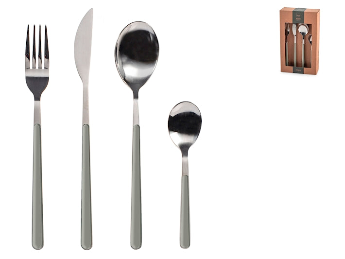 Servizio da 24 posate tavola Nova in acciaio inox, manico in plastica di colore verde salvia. Composto da 6 cucchiai, 6 forchette, 6 coltelli e 6 cucchiaini da caffè. Idoneo al lavaggio in lavastoviglie