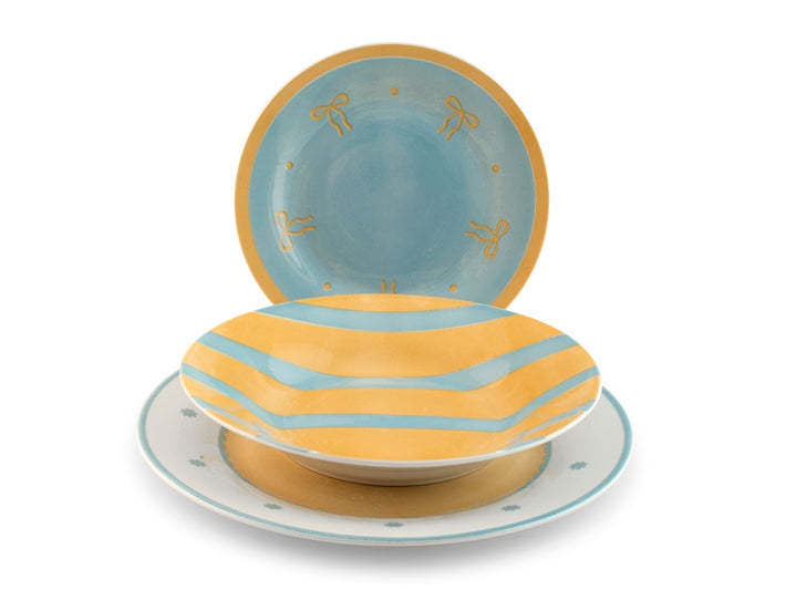 Servizio da 18 pezzi Daisy in porcellana decorata. Composto da 6 piatti piani 27 cm, 6 piatti fondi 20 cm, 6 piatti frutta 19 cm di forma ala. Idoneo al lavaggio in lavastoviglie e all'uso in forno a microonde