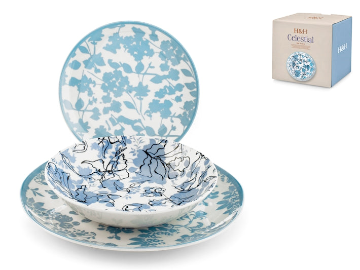 Servizio da 18 pezzi Celestial in porcellana decorata. Composto da 6 piatti piani 27 cm, 6 piatti fondi 20 cm, 6 piatti frutta 19 cm di forma coupe. Idoneo al lavaggio in lavastoviglie e all'uso in forno a microonde