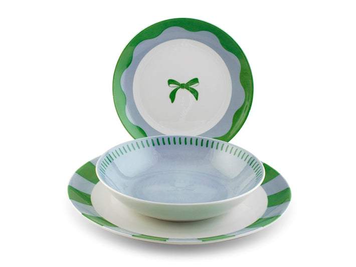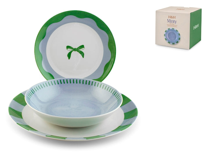 Servizio da 18 pezzi Minty in porcellana decorata. Composto da 6 piatti piani 27 cm, 6 piatti fondi 20 cm, 6 piatti frutta 19 cm di forma coupe. Idoneo al lavaggio in lavastoviglie e all'uso in forno a microonde
