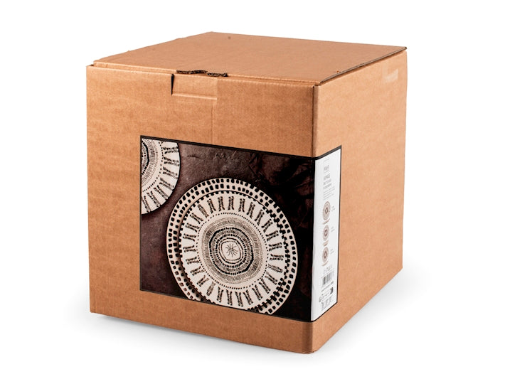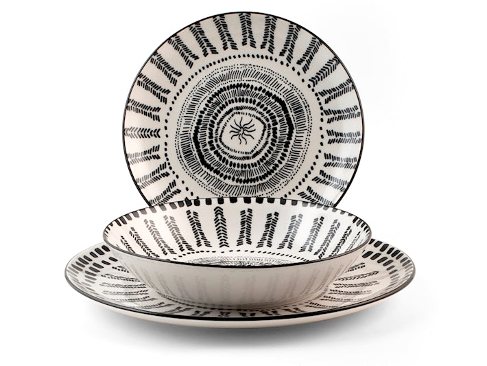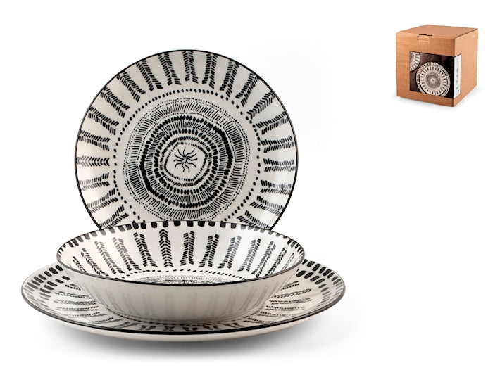 Servizio da 18 pezzi Voyage in porcellana decorata. Composto da 6 piatti piani 27 cm, 6 piatti fondi 20 cm, 6 piatti frutta 20 cm di forma coupe. Idoneo al lavaggio in lavastoviglie e all'uso in forno a microonde