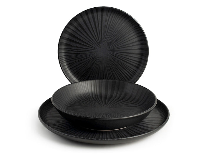 Servizio da 18 pezzi in stoneware dalla finitura opaca, caratterizzato da un motivo geometrico a raggiera di color nero. Composto da 6 piatti piani da 26 cm, 6 piatti fondi da 20.5 cm, 6 piatti frutta da 20 cm. Idoneo al lavaggio in lavastoviglie e all'uso in forno a microonde
